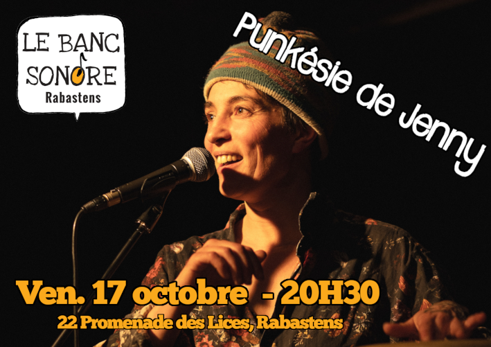 Jenny écrit de la poésie qui déborde et propose des concerts à vivre, elle joue depuis plus de dix ans dans les recoins, dans les culs de sacs, dans les squats, dans les sous-bois, bateaux, ressacs… Ses concerts sont des moments sacrément profanes, poétiques et punk à la fois. Un moment à partager autour de l’amour des mots et de la vie.